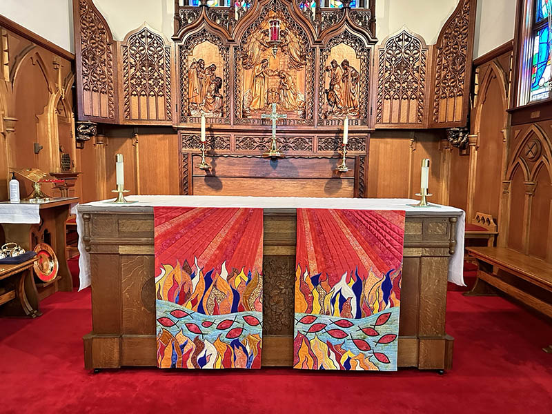 About four years ago, Daniel Fournier, the rector of St Luke, Cedar Hill, asked me if I would make a new altar frontal for our church. I am a fabric artist, and he had seen some of my work. After some thought, I agreed, and I worked on one for Ordinary Time. Over the next year, I completed three more frontals. Each work started with a long period of research. I needed to understand what the liturgical season was all about: its meaning, its symbolism and its importance.
