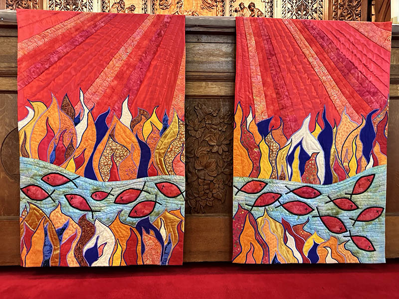 When making this altar frontal, I kept the Pentecost story in mind, praying to the Holy Spirit for inspiration. Flames are a traditional idea for Pentecost, but how was I to represent the whole story — the effect of the inspiration? A particular image appeared in my mind — the ancient Christian symbol of the fish, the ichthus — and though I tried to come up with other designs, I kept going back to that idea. Thus I settled on the ichthus to depict the courageous, dangerous and sometimes secret work of those early apostles who travelled far and wide.