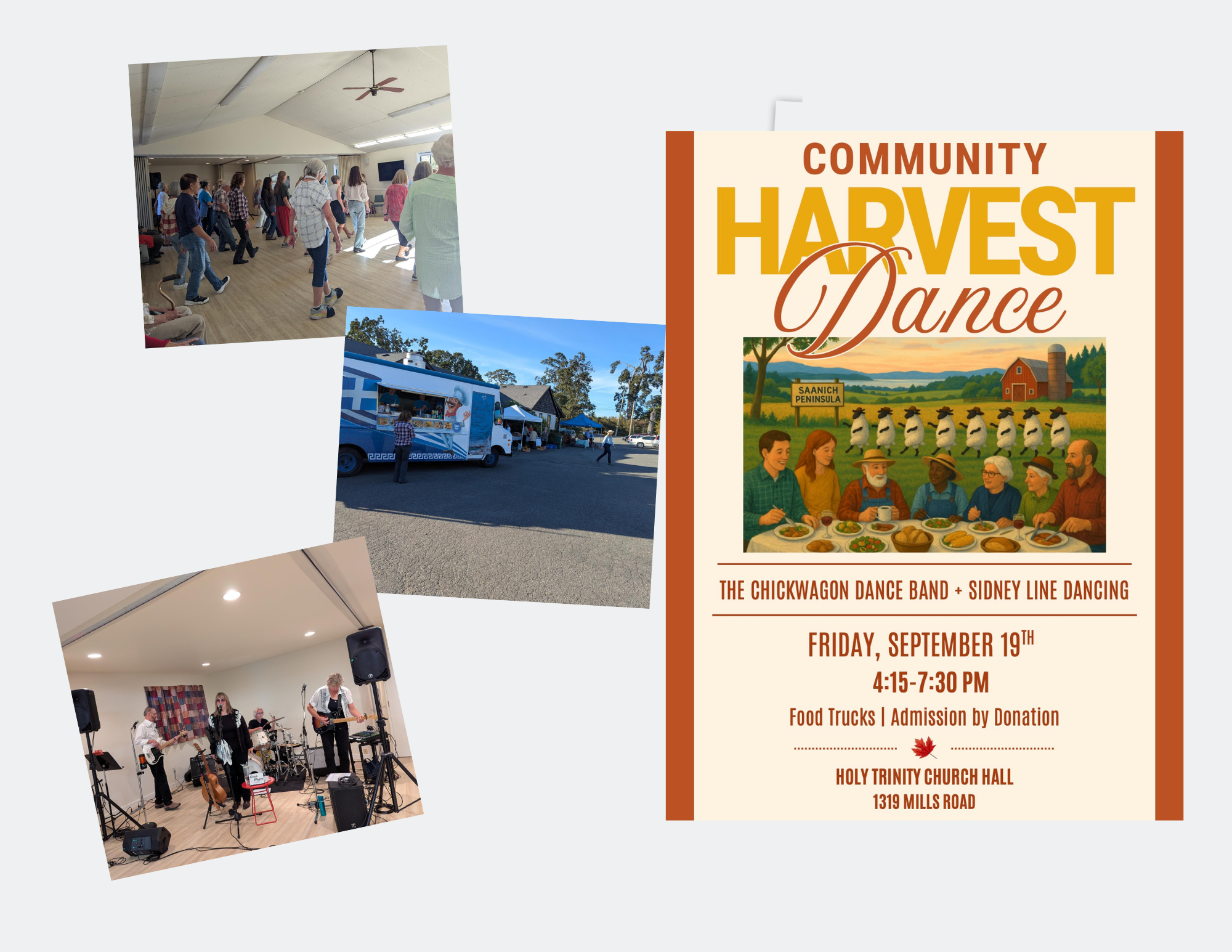 On Sept. 19, Holy Trinity, North Saanich held a community harvest dance in the parish hall to say thank you to the local farmers and give them a fun way to gather. The Chick Wagon Band performed, and line dancing instruction was provided by Sidney Line Dancing. Delicious food was provided by the Al Ibrahim family and the Greek on The Street food truck. Seventy-five people attended from the parish and surrounding community, and Holy Trinity hopes to make this an annual event.