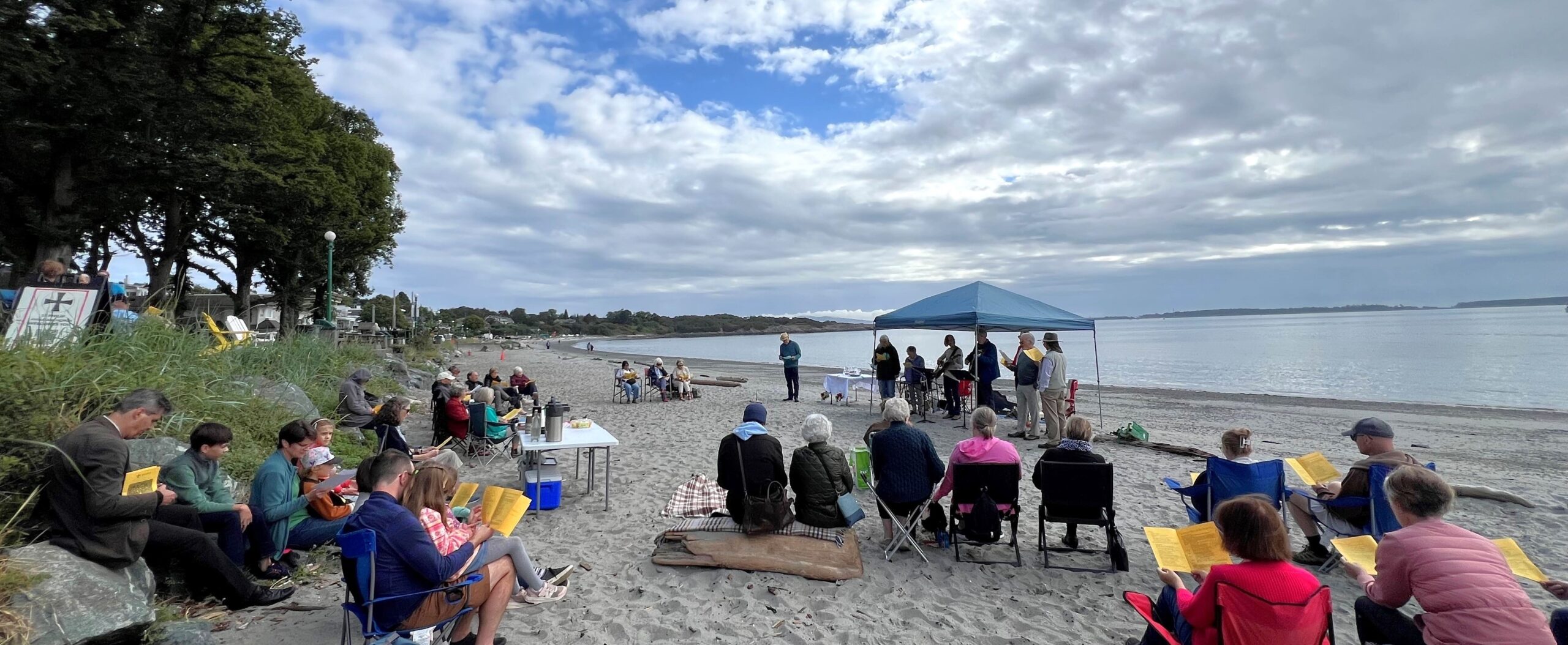 On Sunday, Aug. 17, St. Philip’s, Oak Bay, held a family service at Willows Beach. Most of what happens at a regular eucharist was reprised, though parts of the liturgy reflected the ocean setting; some participants chose to feel the sand between their toes! The children present constructed a cross out of driftwood; the music team led in praising God; and Allen Doerksen, incumbent at St. Philip’s, waded into a difficult passage about the divisive impact of Jesus’ ministry. Afterwards coffee and treats were served; passers-by joined in and stayed for the coffee time. Now that this service has happened two years in a row, it’s safe to call it a parish tradition!