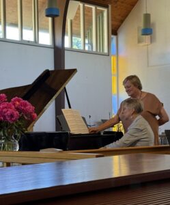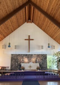 The wood frame church building sits on a large “meadow” on a corner lot. Inside, the sanctuary is simple but striking, with a soaring wood-beamed ceiling. On sunny days, the many windows cast a golden glow on the wooden pews.