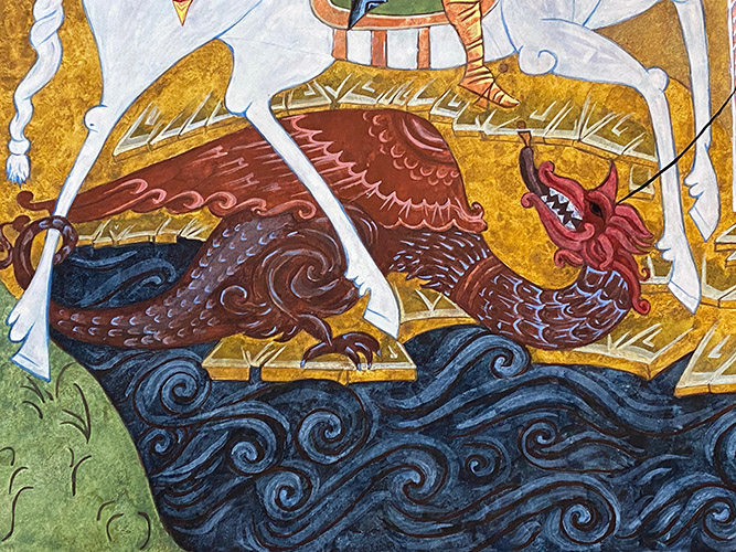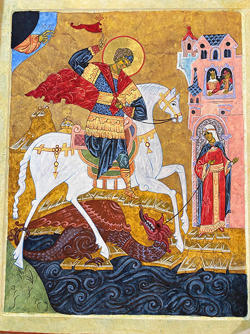 The icon of Saint George and the Dragon led me to contemplate the figures of the horse (representing human willpower) and the dragon (representing the deceiver). I came to appreciate this image for the way it encourages battling against deception and triumphing against it.